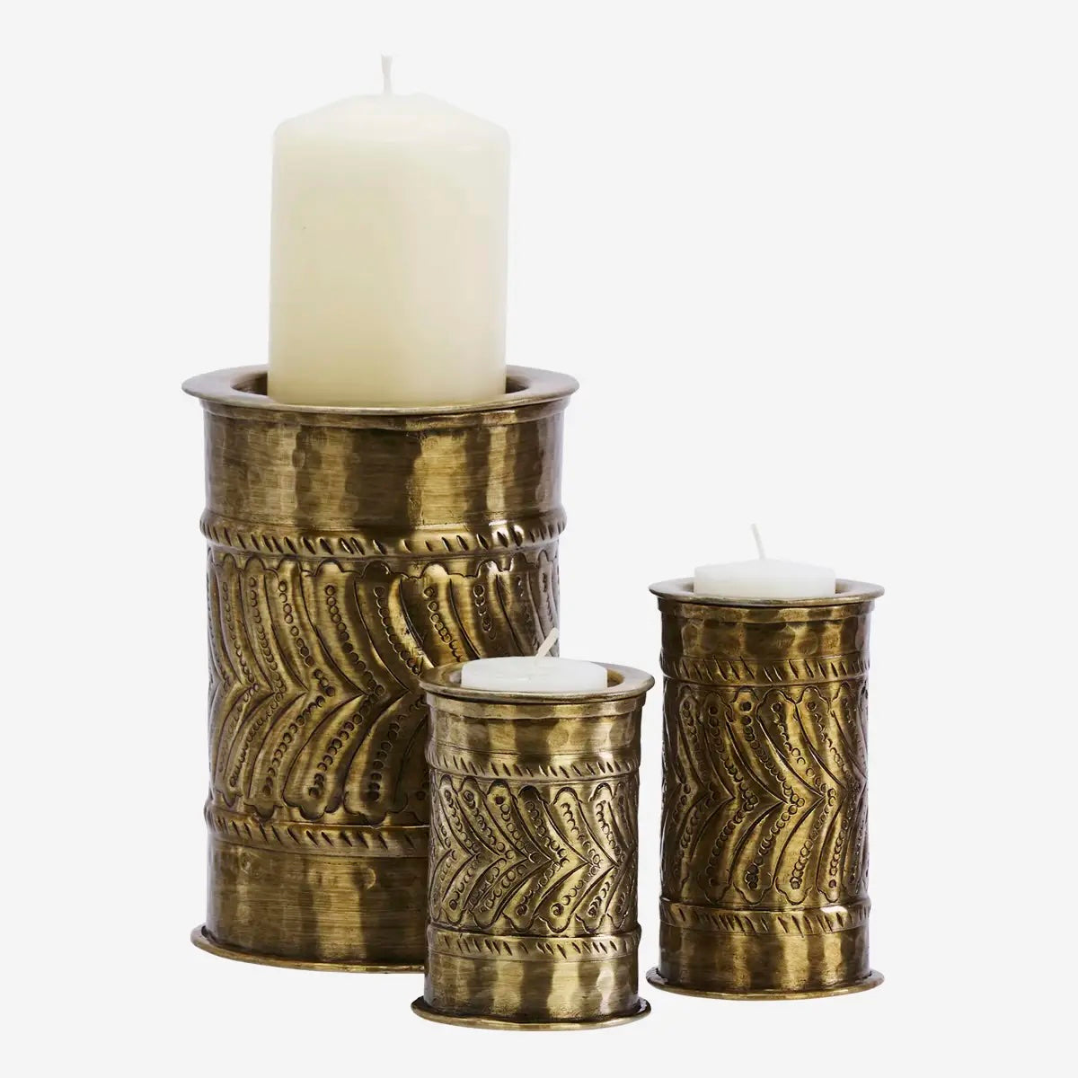 De Aluminium Candle Stand (large) van Madam Stoltz is een sfeervolle kandelaar met karakter. Handgemaakt in India van gerecycled aluminium, krijgt elk stuk een unieke uitstraling. De handgehamerde afwerking in antiek messing en het subtiele folkloremotief geven deze kandelaar een warme, ambachtelijke look die perfect past in elk interieur.