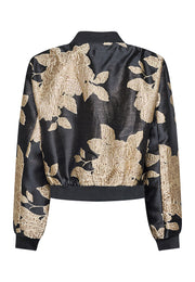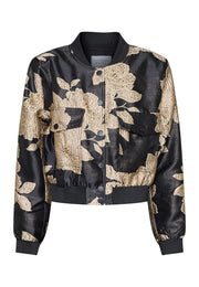 De Garwin-JA22 bomberjack van SisterS Point is een echte blikvanger met zijn goudkleurige bloemenpatroon en subtiele borduursels. De jas is uitgevoerd in zwart en afgewerkt met ribboorden voor een sportieve touch. Dankzij de ronde halslijn, de drukknopen aan de voorkant en de twee borstzakken met kleppen combineert deze jas moeiteloos stijl en functionaliteit.