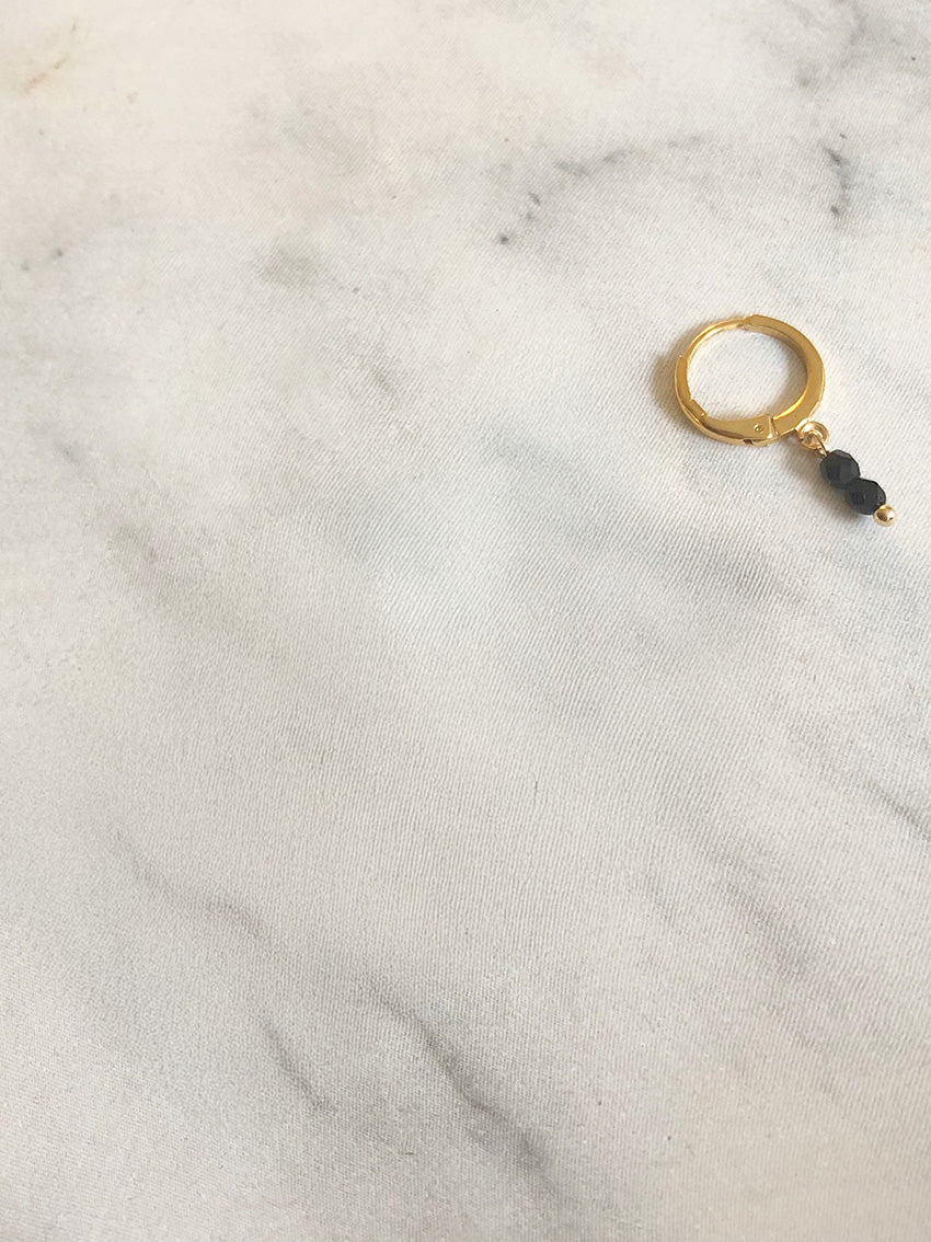 Zwaar verguld oorringetje (? 1 cm) met een bedeltje van zwarte steentjes. De totale lengte is ca. 2 – 2,5 cm. Nikkelvrij en ontworpen in het atelier van Ellen Beekmans in Hilversum. Wordt geleverd in een gratis cadeauverpakking. Let op: dit is een enkel oorringetje.