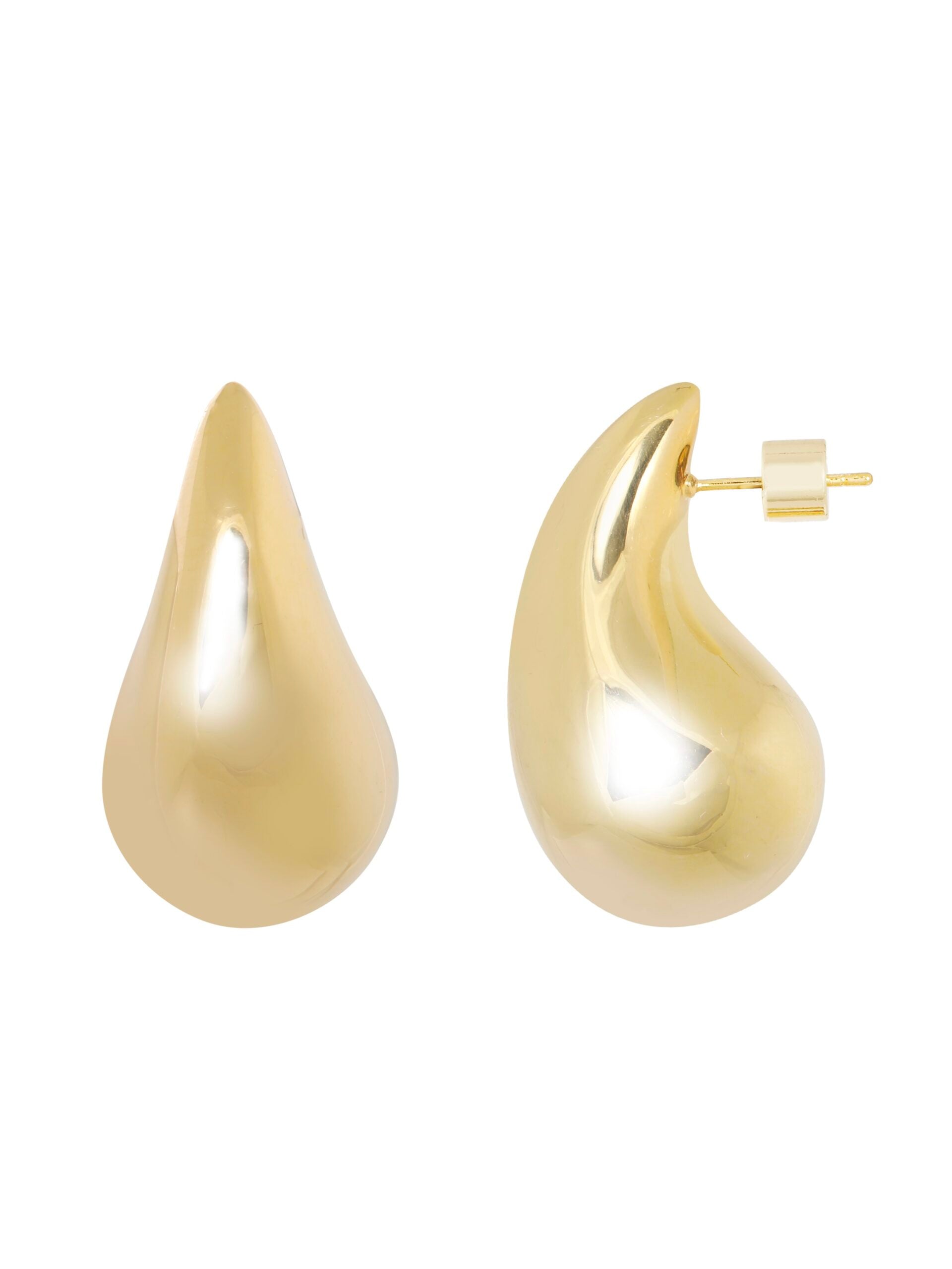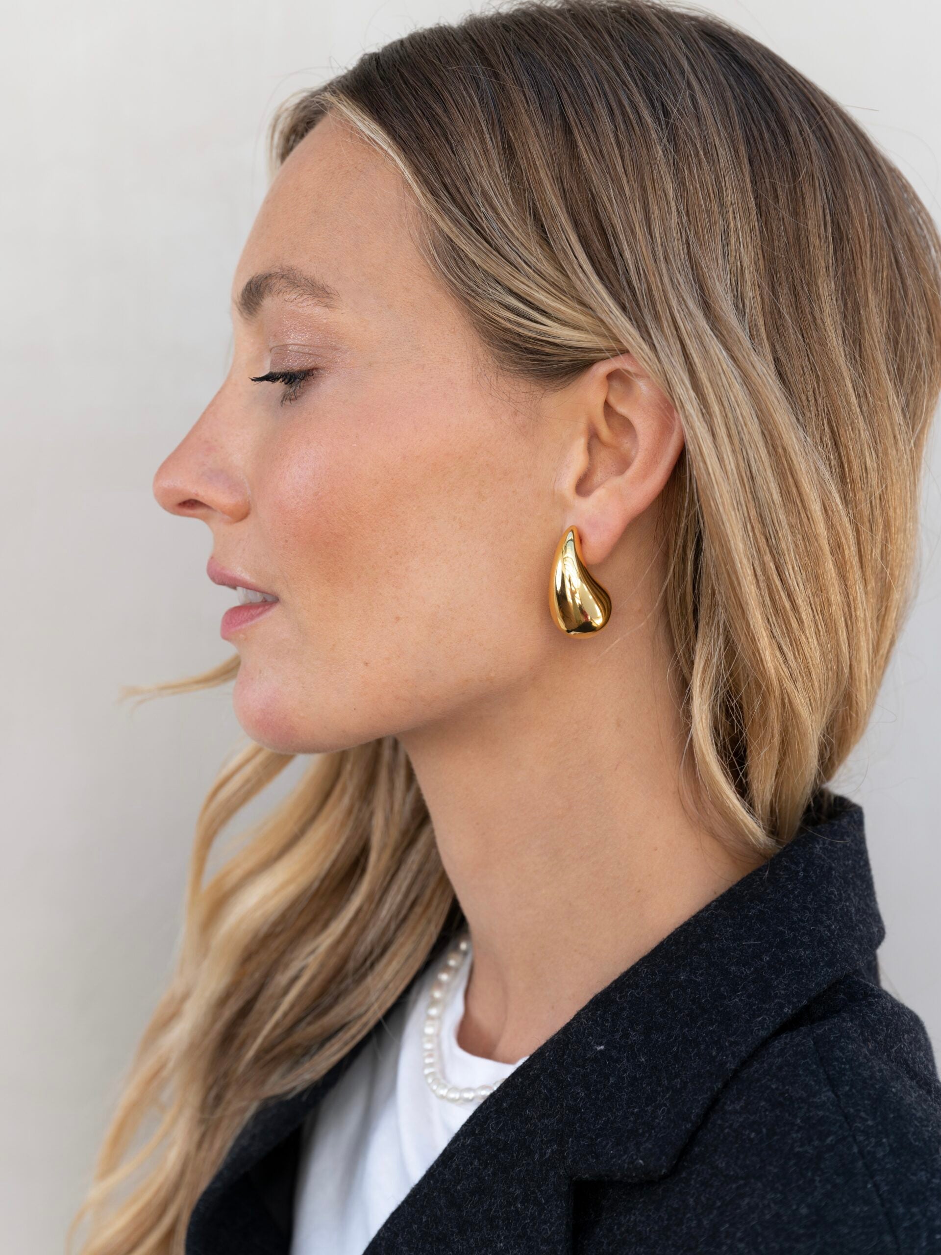 Massieve vergulde druppeloorstekers van Ellen Beekmans. Ze hebben een lengte van 3,3 cm en een breedte van 1,8 cm, en zijn verguld op duurzaam roestvrij staal. Deze oorstekers zijn 100% nikkelvrij en worden met de hand vervaardigd in haar eigen atelier in Hilversum.